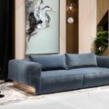 The collection draws inspiration from the seductive romantic beauty of the peacock. A personification of the peacock, the pieces depict the animal’s resplendent beauty using Visionnaire’s bespoke fabrics and materials. The Pavone throne is crafted with 70’s vintage inspired camel leather, vibrant blue and green custom Visionnaire fabrics, and brass coated in regal bronze plating, to give life to an allegorical convergence of Art & Design. The Pavone Armchair series are presented as a fleet of five, an aesthetically conservative version of the solitaire throne. The armchairs share the brilliant fabrics seen in the throne, but with a more contemporary silhouette.