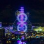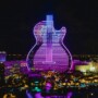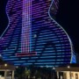 This is the LED lighting show on the newly opened Guitar Hotel at the Seminole Hard Rock Hotel and Casino just outside of Miami. The 34-story destination resort has nearly 30,000 linear feet of programmable LEDs that wrap the building and conform to the unique contoured exterior. The vertical guitar strings on the building extend into the night sky with rooftop light cannons that can be seen for miles. The show is a daily spectacular featuring a series of orchestrated outdoor music and light shows showcasing the LED lights built into all sides of the brand new and immaculate The Guitar Hotel. The lights are programmed to change color and intensity and are choreographed to different songs. Six high-powered beams of light accentuate the production by projecting at least 20,000 feet into the sky. The six lights mimic the strings of an imaginary guitar neck.