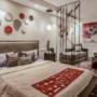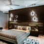 The culminating yet proving its epitome of elegance is the composition of the Master bedroom. Encompassing a lavish design prospect, this space has been smeared with dark beige fabrics and a band of wood, to exhibit its plush vibe. With cappuccino tones stroked over the upholstery instilled, the chic beige sets an apt stage for bold hues of turquoise to create the requisite extravagance. A functionally distanced seating configuration, comprises of a latte toned L-shaped sofa and a luscious lounge chair. A sleek compliment created between the table lamp and the luminous chandelier, is worth a prolonged glance.