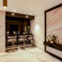 Approaching the upper level via the twirling stairway, a small yet uniquely designed entertainment lounge, appears to the patron. With a reflective feature wall composed in grey and brown veins, the space also incorporates a glass bar with grey leather upholstered bar chairs. A simplistic white ceiling is accentuated by a custom made ingenuine chandelier.