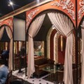 The lit bar backdrop encompassing waffle slab circumscribed in an arch, serving as the showstopper for the walkthrough. The glamorous booth seating on the right flanked by heavy curtains is again transitioned through splendid orange arches with ornate white motifs embellished upon, setting up the true fashion of the space. The booths are segregated assimilating the arch-shaped brass lattice accentuating the stunning ornamentation and luxe. This amorous setup works as a masterstroke for the entire area.