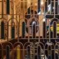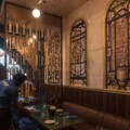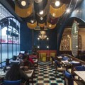 print forms to be a reminisce of gothic stained-glass windows leaving a colossal impression on the patron’s mind. An enormous candelabra chandelier dangles from this painstakingly done ceiling making a statement while rendering a timeless appeal to the ceiling design. A giant glass ellipse with a pattern similar to the brass lattice formulated with vinyl stickers, forefronted by the DJ area next catches the eye of the visitors. An array of arch-shaped mouldings on the walls confining bohemian artwork serves to be the focal facet for the very interior design scheme. The intricate carpet design below the authentic United Coffee House seating configuration further augments the magnificence.