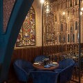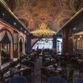 Moving further to the main dining space through an enormous arch, one enters into a transition area manifested from the timeline of divergent eras of architecture. The first thing one may notice in here is the Baroque print in the vaulted ceiling that oozes opulence and grandeur. This dramatic
