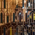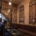 print forms to be a reminisce of gothic stained-glass windows leaving a colossal impression on the patron’s mind. An enormous candelabra chandelier dangles from this painstakingly done ceiling making a statement while rendering a timeless appeal to the ceiling design. A giant glass ellipse with a pattern similar to the brass lattice formulated with vinyl stickers, forefronted by the DJ area next catches the eye of the visitors. An array of arch-shaped mouldings on the walls confining bohemian artwork serves to be the focal facet for the very interior design scheme. The intricate carpet design below the authentic United Coffee House seating configuration further augments the magnificence.