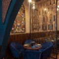 Moving further to the main dining space through an enormous arch, one enters into a transition area manifested from the timeline of divergent eras of architecture. The first thing one may notice in here is the Baroque print in the vaulted ceiling that oozes opulence and grandeur. This dramatic