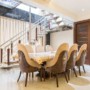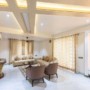 Moving upstairs, one enters the dining cum lobby area encompassing an eloquent yet extraordinary spirit. The chic furniture configurations including Italian pure leather sofa from TURI and wooden dining table made of teak wood and brass elements here grant the expanse a contemporary sophistication. A fascinating feature wall replicating a TV unit has been bestowed with lit shelves that kindle the unique décor elements kept in there. A twin ceiling concept culminating an elegantly outlined hash sign boast off an eclectic design arrangement in the dining and the formal living area behind, respectively.