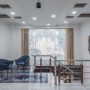 Meandering with the flow of the layout, one reaches the first floor to step onto this mesmerising digital flooring conferring onto an epitome of “cybertecture, the hints of which are also visible from the ground floor which serves as a showstopper. The massive full-height window with digitally printed glass is assembled in such a way that one can see a play of shadow dancing on the purple flooring imparting great impressions for the kids to savour the uniqueness of the space. The blue chesterfield armchairs laid out perfectly complements the purple flooring.
