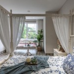 The parents’ bedroom is earthy filled with subtlety. The jute wallpaper, white wooden carved bed resembles aristocracy. The master bedroom is treated with silk backdrops while the bed draws the attention with an attached dressing area. Each of them has the drawers stationed besides the bed grazing the monotony of the space. The classic vintage and contemporary ambience is an éclat of vintage charm just out of a postcard from the ’80s.