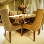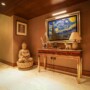 The entrance foyer is designed to replicate a whimsical evening, with the framed replica of Van Gogh’s infamous “Starry Night” above the console, complimented by the artwork of the nocturnal ‘Owl’. The Buddha water body creates a mesmerizing fountain-in-the-garden like feel to the enclosed interior space. The spot lights in the foyer are designed to depict stars in the night sky, completing the whole mirage of a “Starry Night” indoors. As the foyer hallway opens up into the living and dining space, the fusion of traditional and contemporary becomes apparent. The gorgeous glass chandelier above the modern dark wood dining table is an eye-catching piece you just can’t help but admire. The seating arrangement right next to it is doned with fabric inspired by traditional Indian motifs; like the gorgeous orange elephant upholstery for the swivel chair and the chevron pattern on the sofa back.