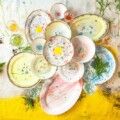 The tablecloth reproduces her large glazed plexiglas painting, two large yellow clods flying in the sky and a small arch of grass blades. The plates of Coralla Maiuri are the leading actors of this fresco. They belong to different collections, together they are a playful mix. Some have a primeval dot in the center; others have seeds and pollen chasing each other in a spiral. Musical instruments keep fine tuning, a rabbit must have run on the table because it has scattered earth here and there.
