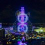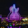 This is the LED lighting show on the newly opened Guitar Hotel at the Seminole Hard Rock Hotel and Casino just outside of Miami. The 34-story destination resort has nearly 30,000 linear feet of programmable LEDs that wrap the building and conform to the unique contoured exterior. The vertical guitar strings on the building extend into the night sky with rooftop light cannons that can be seen for miles. The show is a daily spectacular featuring a series of orchestrated outdoor music and light shows showcasing the LED lights built into all sides of the brand new and immaculate The Guitar Hotel. The lights are programmed to change color and intensity and are choreographed to different songs. Six high-powered beams of light accentuate the production by projecting at least 20,000 feet into the sky. The six lights mimic the strings of an imaginary guitar neck.